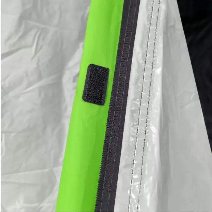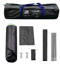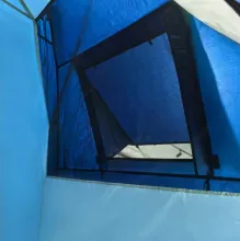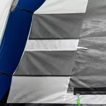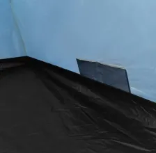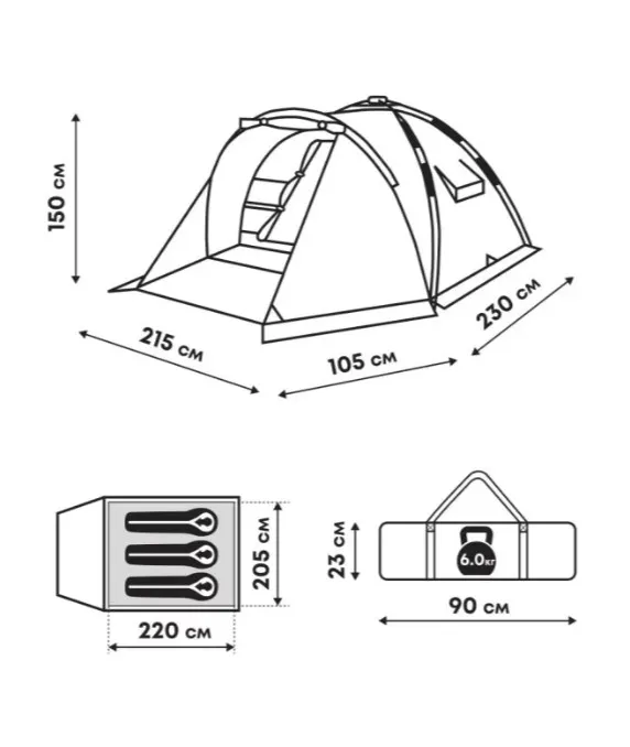 Размеры в разложенном виде — 335×215×150 см, спальное отделение 220×205 см, так что места для троих с запасом. Перед входом есть тамбур — обувь, рюкзаки или мокрую одежду можно оставить снаружи, не занося в спальник. В модели предусмотрены большие окна, юбка по периметру, тонкая москитная сетка, карманы и крючок для фонаря. Вентиляционные элементы помогают регулировать микроклимат в тёплую погоду или при сырости.